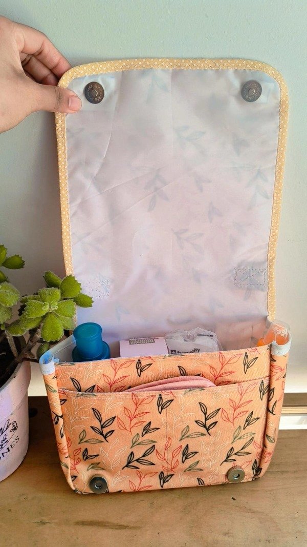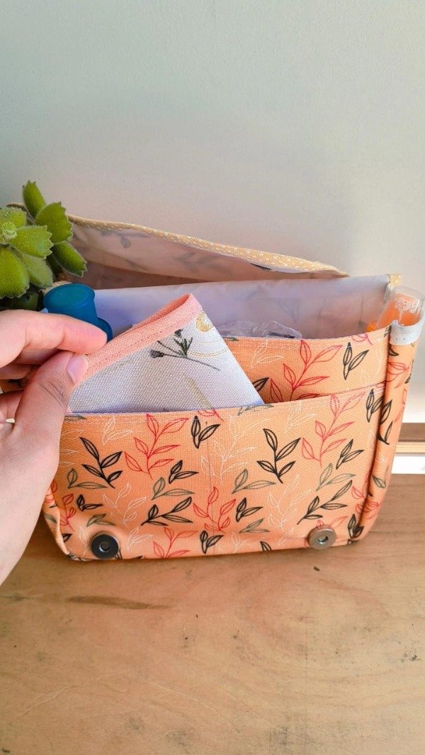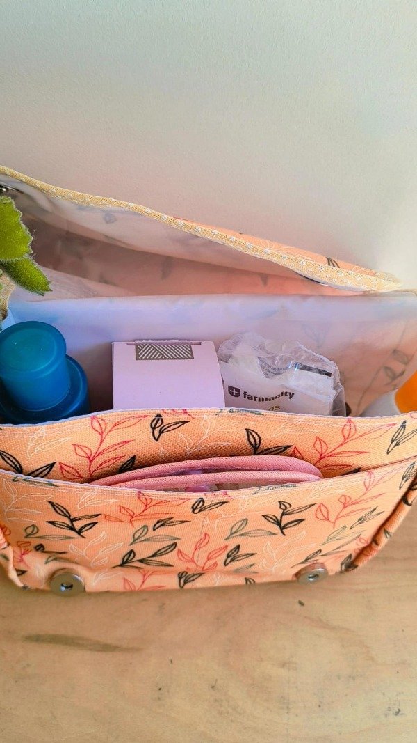 Tiene 2 compartimentos, uno grande para que pongas las cremas, el shampoo, el desodorante, y un bolsillo más pequeño para que pongas sobres, toallitas de mano, etc.